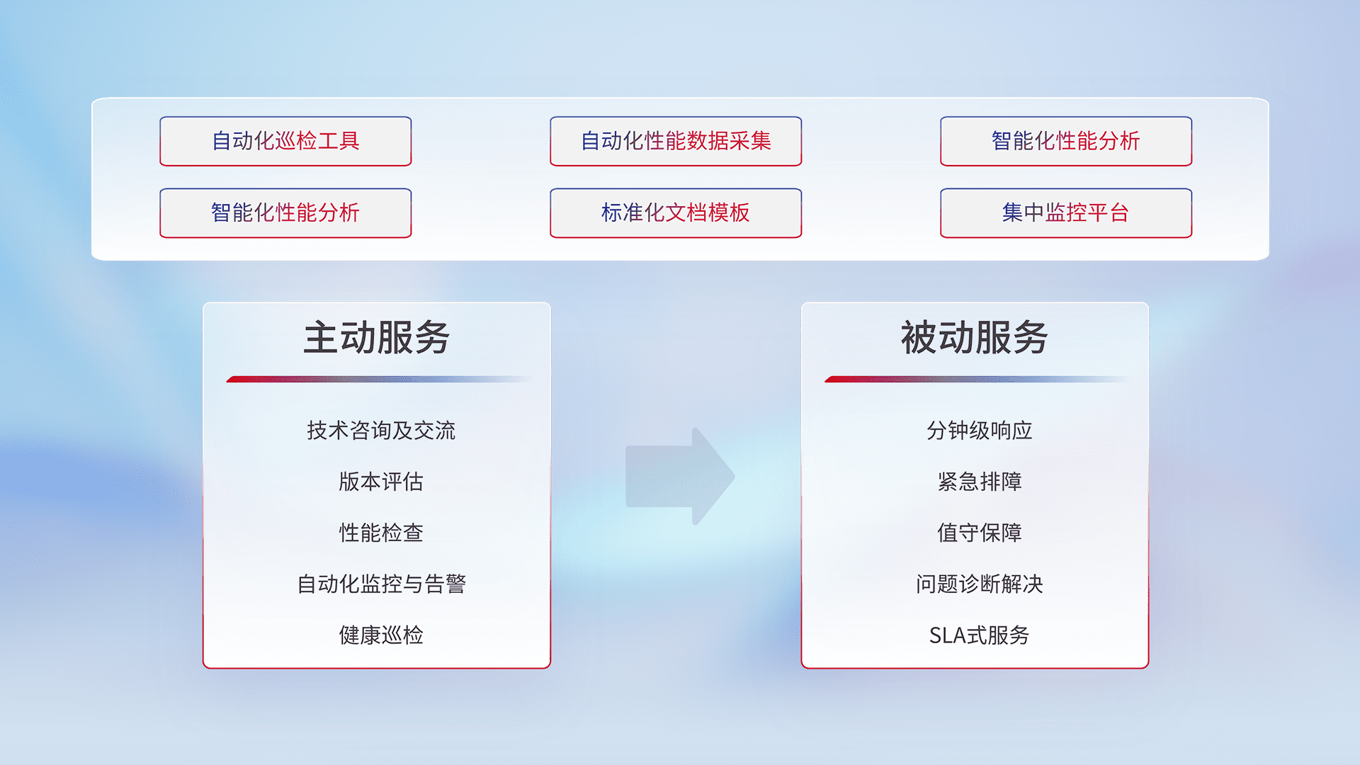 智能化工具和标准化文档,,保障服务质量,,,提供主动服务(包含技术咨询、、版本评估、、性能检查、、自动化监控与告警、、健康巡检)和被动服务包含(分钟级响应、、紧急排障、、、值守保障、、、、问题诊断解决、、SLA服务)。。。